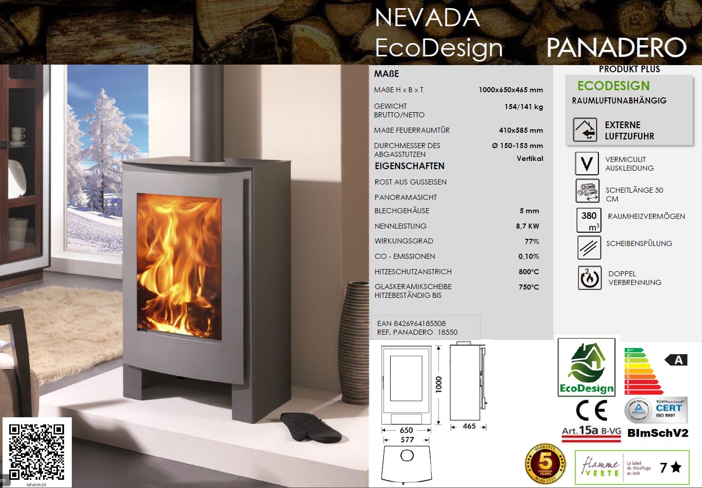 - Heiztechnische Produkte von Panadero werden so entwickelt und gefertigt, dass sie nicht nur gut aussehen, sondern auch den Belastungen im Alltag jahrelang standhalten. Der Nevada ist aus 5mm dicken Stahlplatten gefertigt. Der Rahmen ist komplett verschweißt (nicht gepunktet, genietet oder geschraubt). Die thermischen Belastungen und Spannungen, denen ein Kaminofen bei Erhitzung und Abkühlung ausgesetzt ist, werden aufgenommen, ohne dass sich der Ofen spürbar verzieht. Dies gewährleistet ein hohe Stabilität und Langlebigkeit.